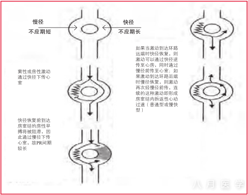 图3 房室结折返性心动过速发生的电生理机制。解剖学病因是存在房室结双径路,即快径不应期长而慢径不应期短。