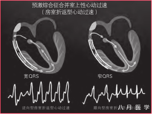 正向房室折返性心动过速:这种情况下冲动通过正常房室结 - 希氏束 -浦肯野路径前向传导,通过旁路逆传回心房。因心室激动是通过正常传导系统,QRS波形窄。然而可能存在心率相关性束支阻滞,从而出现典型的左束支阻滞或右束支阻滞的宽QRS波。QRS波形态和预激时的窦性波群不相似。