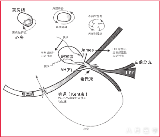 图1与心动过速相关的旁路,包括窦房结(窦房结内折返)、心房(典型和非典型房扑)、房室结(房室结折返性心动过速)和L-G-L预激或W-P-W预激(房室折返性心动过速)