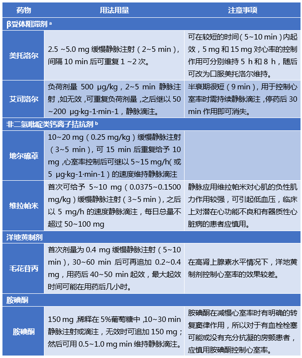 房颤急性发作时控制快速心室率,一般需使用经静脉的药物,因其起效快、作用肯定。药物主要包括4 大类:β受体阻滞剂、非二氢吡啶类钙离子拮抗剂、洋地黄类和胺碘酮。