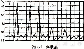 (3)间歇热:体温骤然升达高峰,持续数小时,又迅速降至正常水平,无热期可持续1天至数天,如此高热期与无热期反复交替出现,见于疟疾,急性肾盂肾炎等。