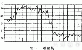 (1)稽留热:是指体温明显升高在39℃~40℃及以上,24小时内体温波动相差不超过1℃,常见于伤寒、大叶性肺炎、流行性脑脊髓膜炎、恙虫病等症状明显期。