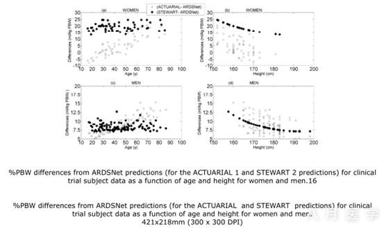 结果:不同的理想体重公式中存在着明显而又潜在的区别。ACTUARIAL和ARDSNet两种方法在女性身上的表现各有千秋。ACTUARIAL和ARDSNet两种理想体重公式在年龄和升高上超过30%的女性以及24%的男性身上有统计学上的差异。STEWART和ARDSNet两种理想体重公式相比是25%和15%。年老和个子矮的对象,尤其是女性会有巨大的数字上的差异。临床试验中实际的差别在男性高达15%,女性高达24%。