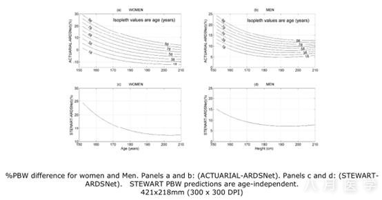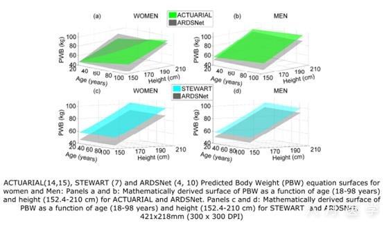 方法:理想体重公式利用体重/年龄/性别作为输入变量。我们比较了在临床实验中使用的涵盖生理范围内的年龄和身高的计算公式:NIH ARDS Network (ARDSNet), actuarial table (ACTUARIAL), 和 Stewart(STEWART)方程,用三维和二维的表面分析来比较这些理想体重方程。然后我们用实际临床受试者的年龄身高指标来量化理想体重方程之间的差异。