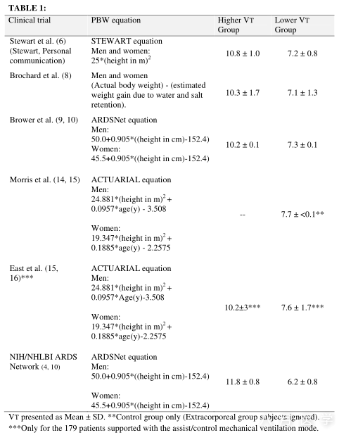 结论:不同理想体重公式计算潮气量的明显差异可能是不同研究间差异的原因。不同的研究应当采用同样的理想体重公式标准。我们推荐使用ARDSNet的理想体重公式,因为它为确定6ml/kg的理想体重提供了一个适当的目标。